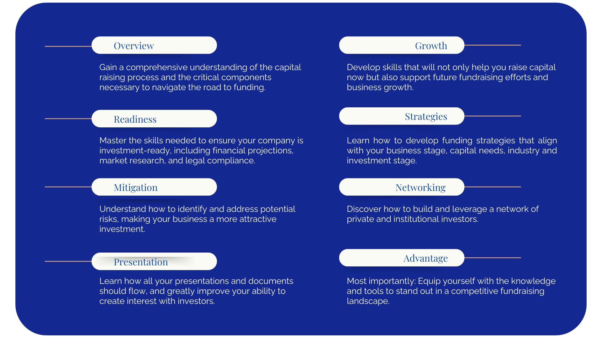 By mastering the art of capital raising, you not only secure the funds needed to propel your business forward but also gain a strategic advantage over competitors. This training will equip you with actionable insights, proven strategies, and direct connections to potential investors, empowering you to turn your vision into reality and achieve exponential growth.